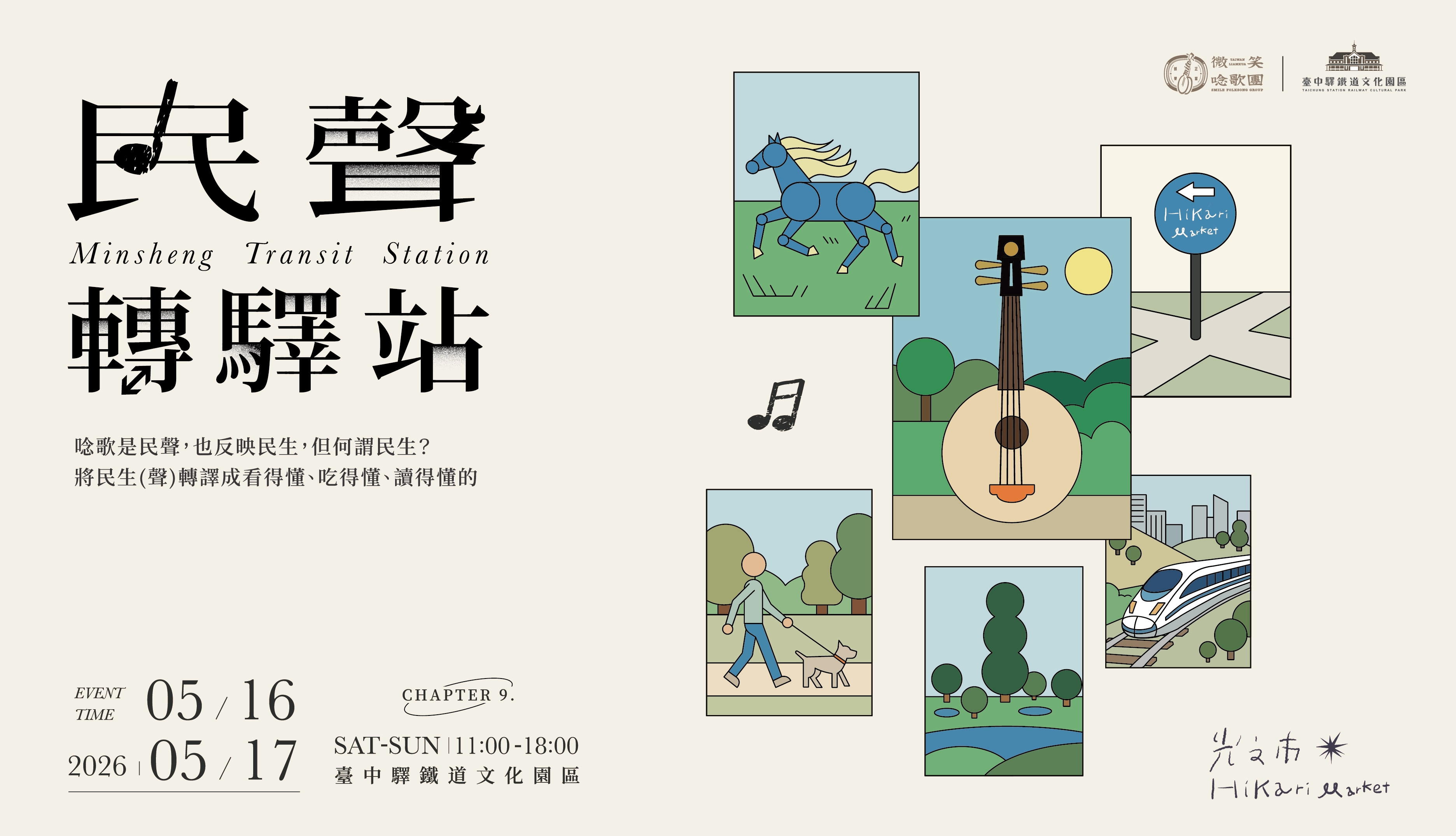 2026年光之市與臺中驛鐵道文化園區以及微笑唸歌團攜手,以民聲&民生為主題,驛站為運行載體雙軌並行,在光的路徑上探索各種形態樣式的民聲製造,無論是手藝&飲食製作、飲茶&咖啡亦或是選物、小誌,這些細緻的製作期待能一起在驛站相會。